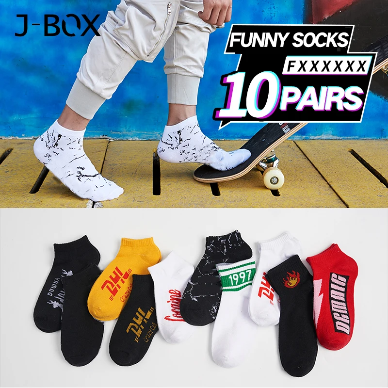 وانت debido aشراء Skateboards, J-BOX 10 أزواج القطن سعيد الرجال الجوارب DHL بارد الهيب هوب المتناثرة قصيرة جورب لوح التزلج الخريف الشتاء تنفس الكاحل جوارب بأشكال مضحكة أرغب في شراء